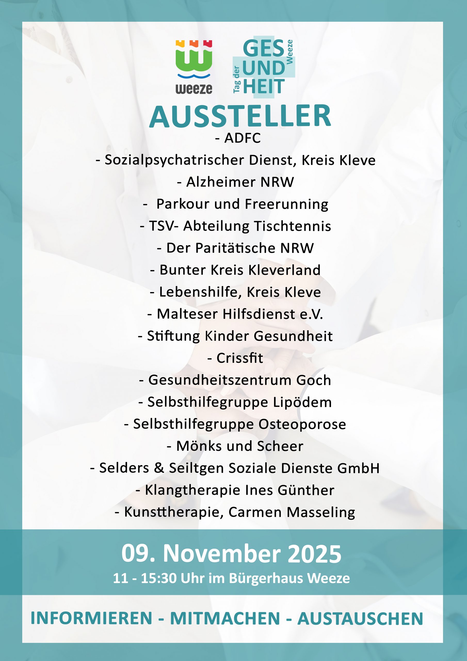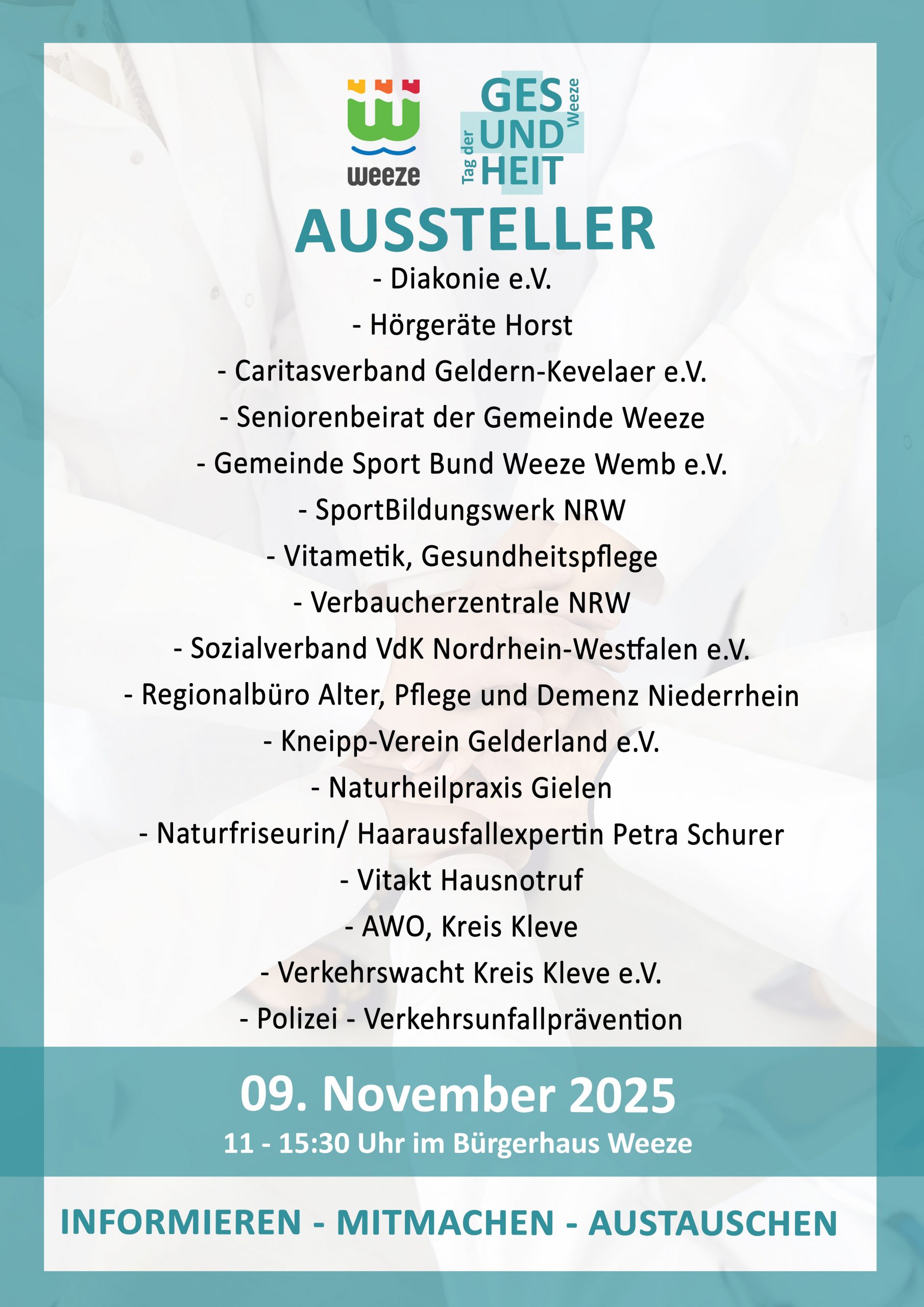 | Tag der Gesundheit Weeze | 09.11.2025 | 11:00 Uhr - 15:30 Uhr | Bürgerhaus Weeze | Plakat Aussteller_1 Aussteller_2 |